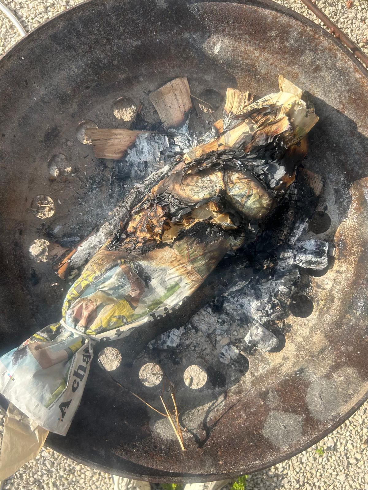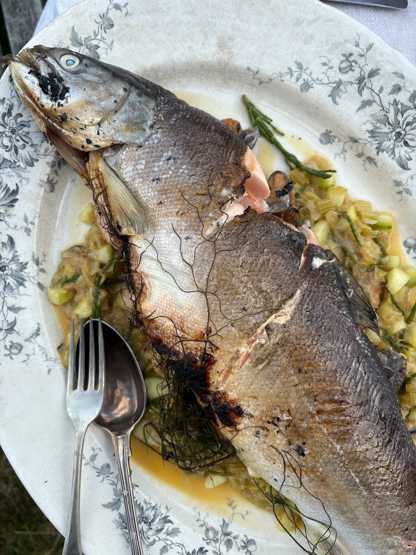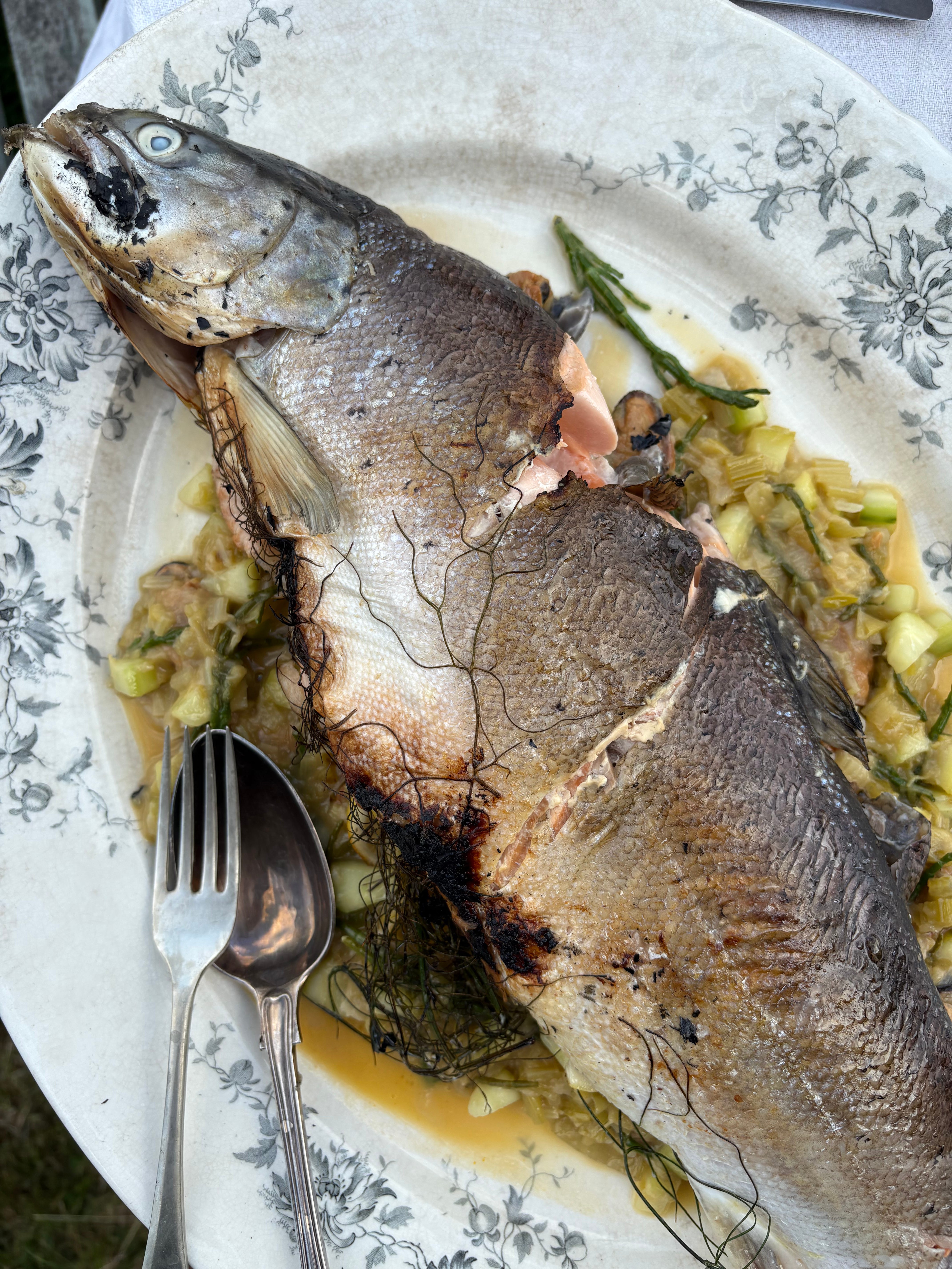 For the fish I channeled my inner Rick Stein, having discovered that I didn’t, in fact have any charcoal left. So I built a fire, wrapped the trout in a few layers of the Ripon Gazette (a couple more wouldn’t have hurt, as it turned out), dunked it in water for a bit, and cooked it directly on the embers. Worked beautifully.