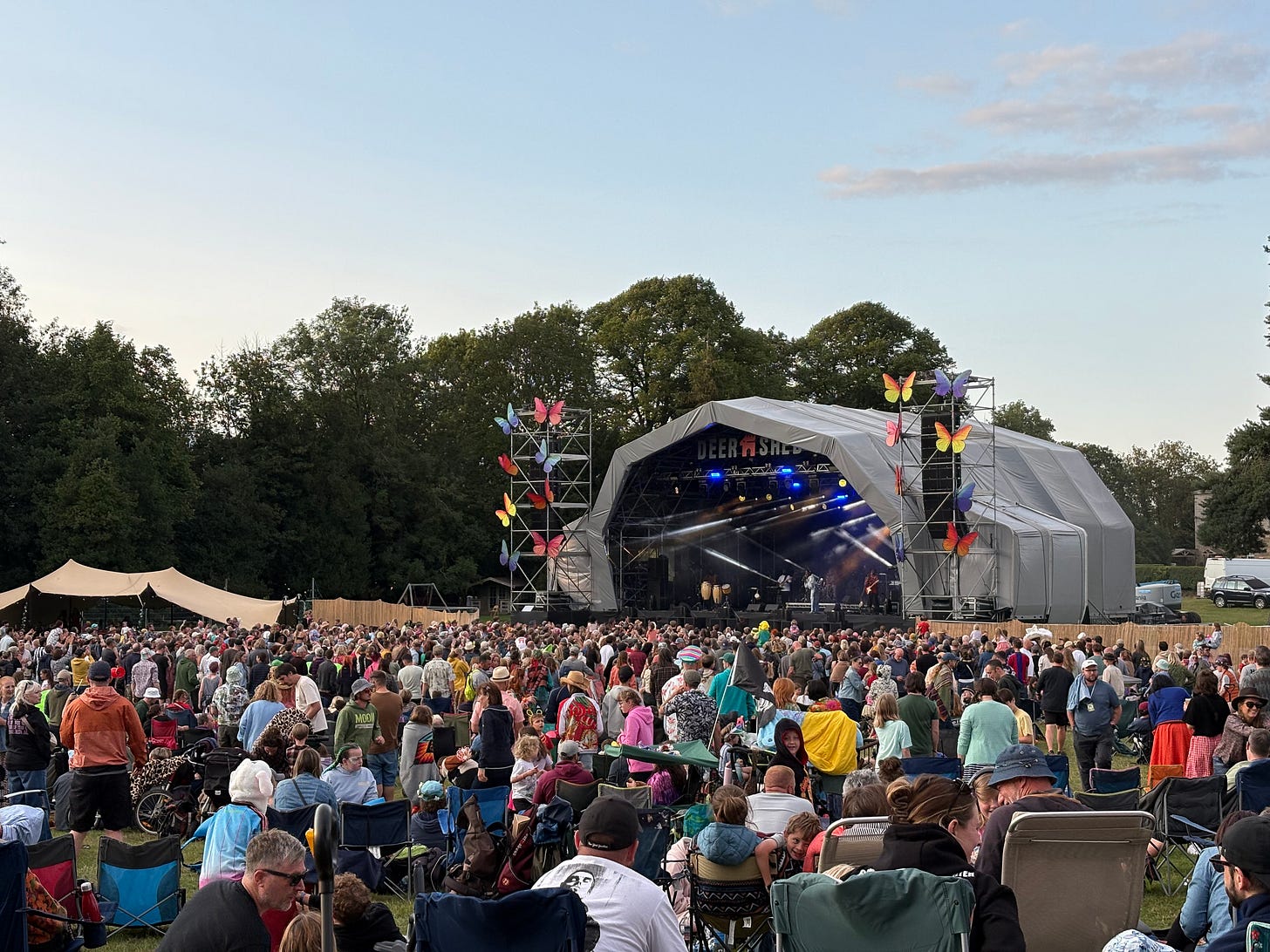 Last weekend found us doing at least two of those things, three if you count sitting on a picnic table eating, at one time or another, jerk chicken/daal and chips/endless pizzas/more chips/egg banjos/churros and so on as picnicking, four if you’d associate the caterwauling that came from the so-called Silent Disco at 2am as akin to Florence Welch’s singing. A grey area.